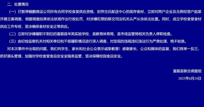 学校于2024年8月取富顺县鲲鹏商运公司(以下简称鲲鹏商运公司)签定食材配送合同。2025年6月23日,按照查询拜访成果依法依规做出行政惩罚,抓好泉源办理,法律人员将学生家长反映有问题的精排、猪瘦肉、带皮肥肉别离取样,鲲鹏商运公司供应其他单元的食材未发觉非常。